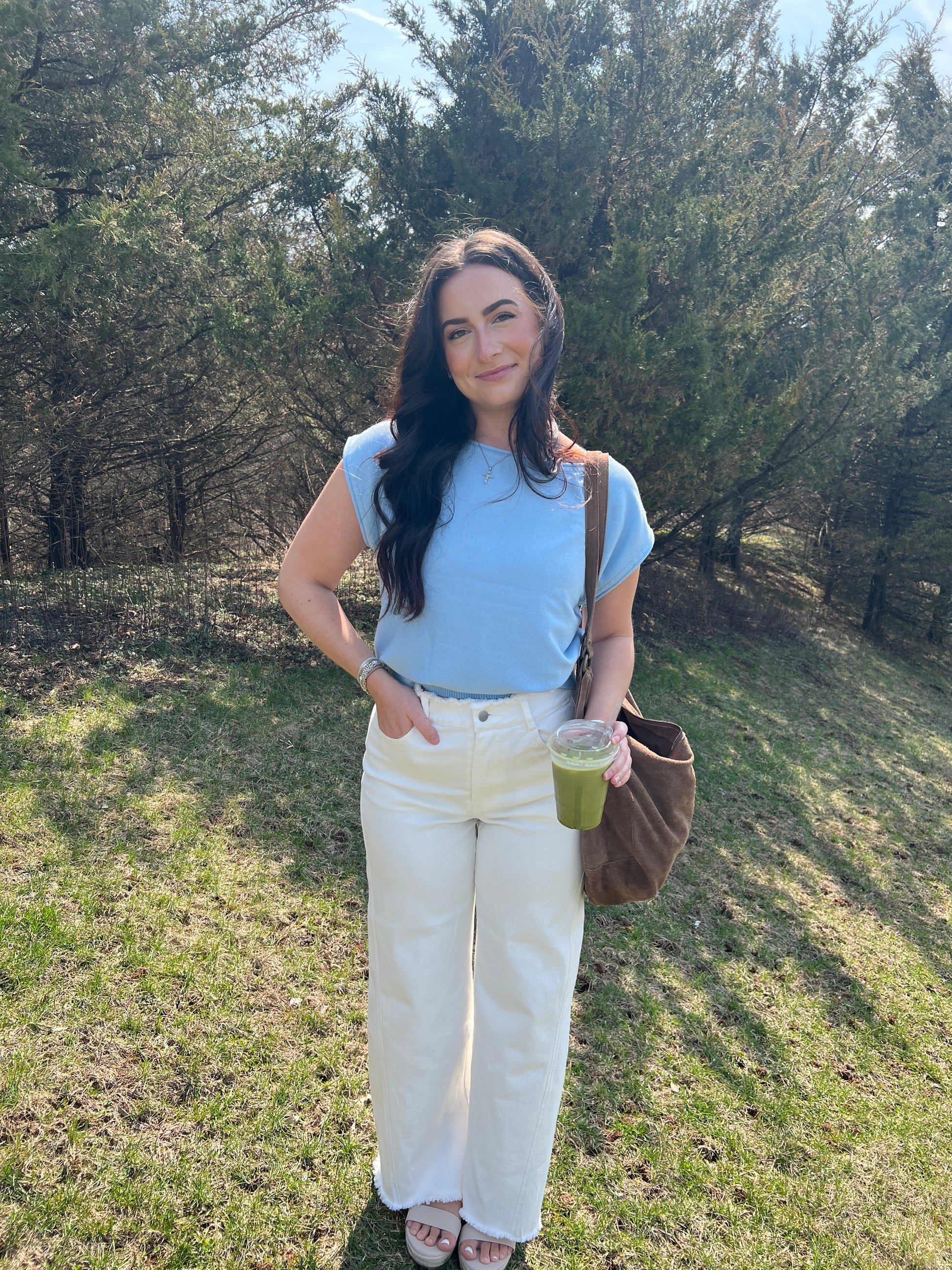 Baby blue boat neck wide shoulder top.
